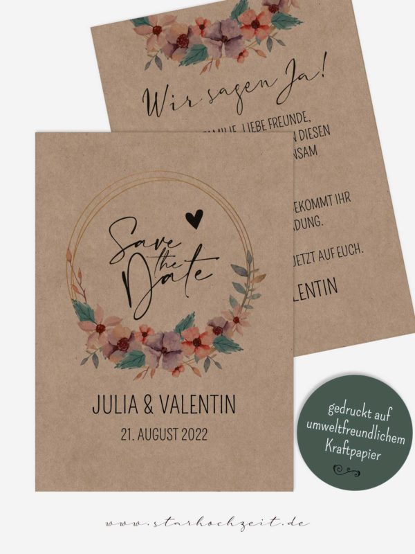 Mit dem natürlichen Design dieser Save-the-Date Karte „Kraftpapier Blumenkranz Aquarell“ überrascht ihr eure Hochzeitsgäste. Die Karten werden auf umweltfreundlichem echten Kraftpapier gedruckt damit wirkt das Design der Karte sehr natürlich.